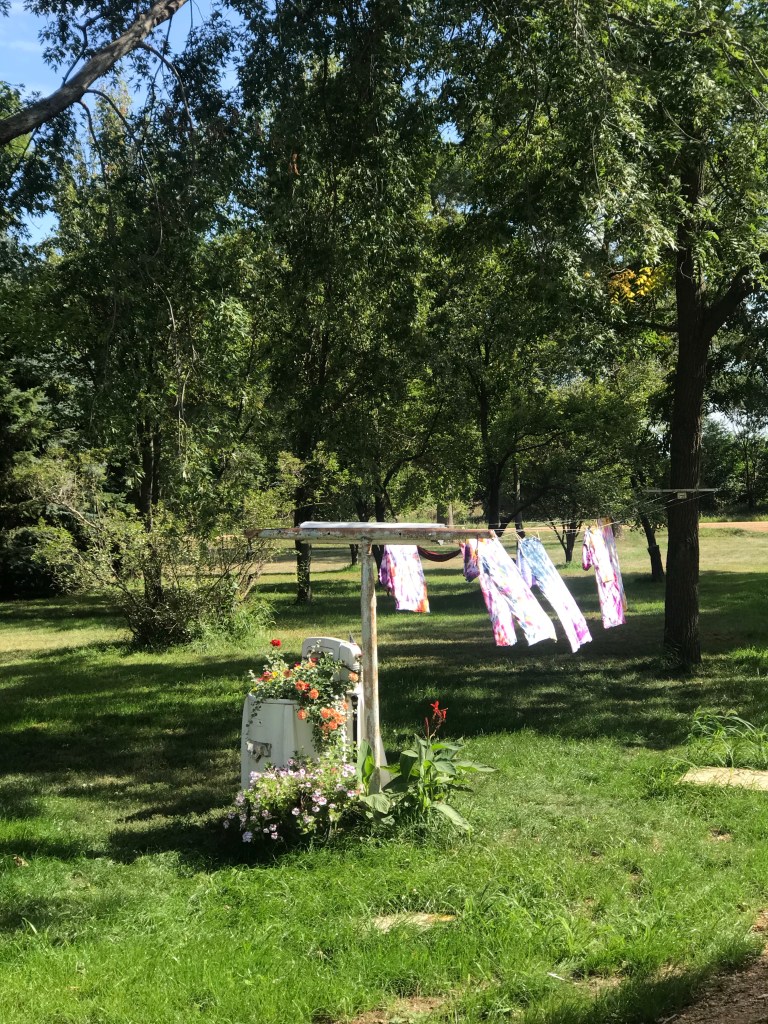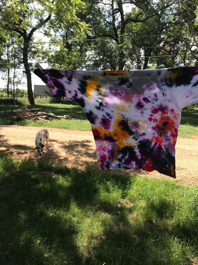 Tie dye day at the farm. This was my first attempt at it. We soaked the shirts in a solution of some sort to start with. I then was issued a handful of rubber bands. All I had to do was tie the shirt in random knots. The knot tying is what gives the shirt the unique pattern. My daughter applied the dye as she has more experience and an artists eye. I think they all turned out well. Mine might be the best though.
