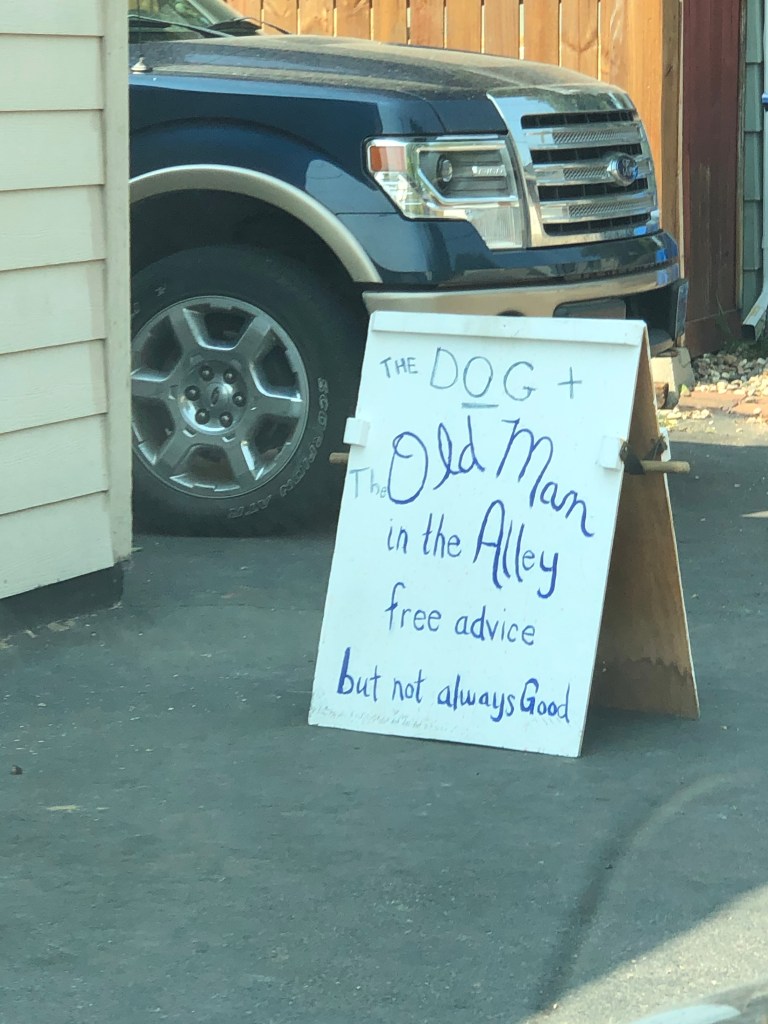 I stopped by and talked to an old friend today. We worked together for several years. He was always the guy who would listen and loved to joke around. Unfortunately the Social Distancing has curbed his ability to chat with people face to face as he loves to do. The sign let me know he is still his humorous and good natured self (even if he is cantankerous at times). The chat went well and it was nice to connect again. Remember your friends during this time. Don’t let a random disease let an old friendship go stale. Remember to at least touch base with them even if it is from 6 feet away. The sign helps me remember to do whatever it takes until the world resumes some sort of normalcy. His free advice was awesome as always…
