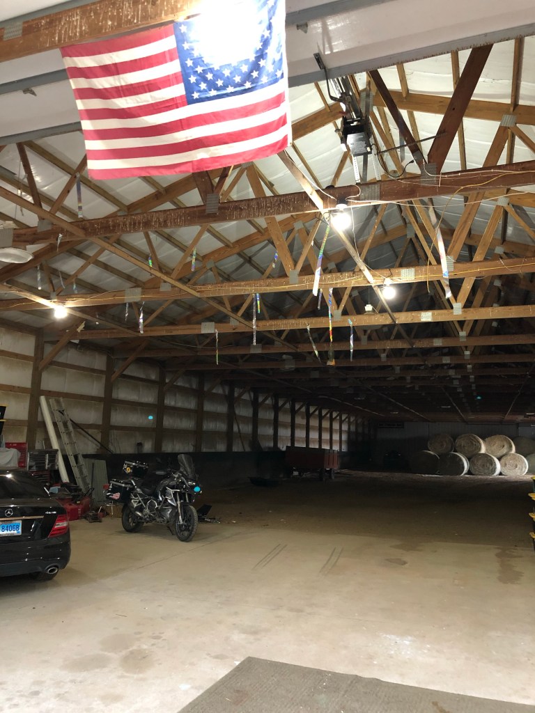 Time to remediate the sparrows from the machine parking side of the garage. I Put up some lights and Mylar stringers. The noise and motion is supposed to keep them away. I will have to see how this works out. If you look in the background you can see a plastic hawk hanging from the rafters. The hawk actually worked pretty well for the most part. Time to get the rest of the sparrows to hang out on their side of the barn.