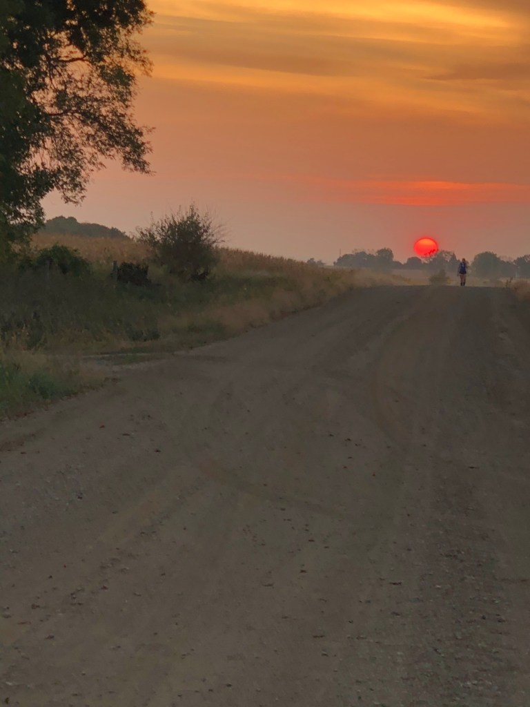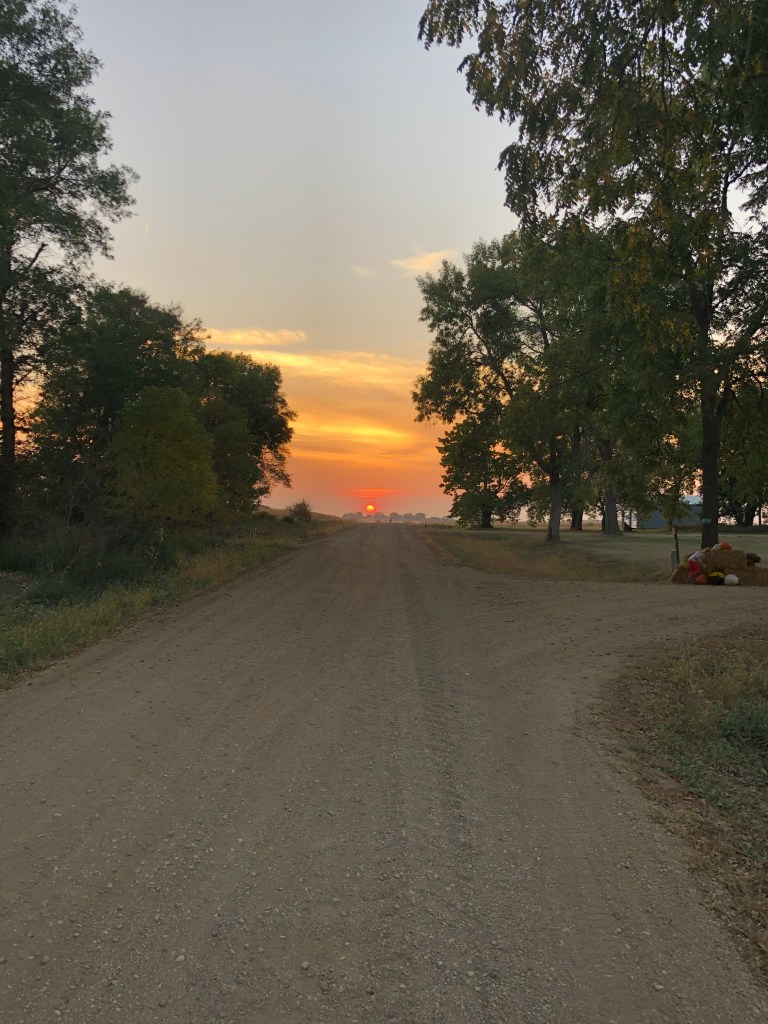With the fires on the west coast and the harvest dust, the sunrises and sets have been pretty awesome to see. These sunrises and sets remind me of my days in Korea. The sun always seemed to take up so much of the sky. This is finishing up a 2 mile walk and looking back. It was a great night to be alive!