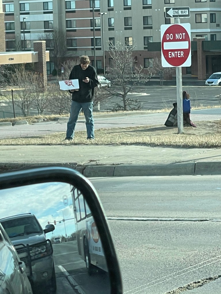 When you are too busy texting at work to hold your sign properly. Facing the wrong direction as well. Texting is such a distraction these days it seems.