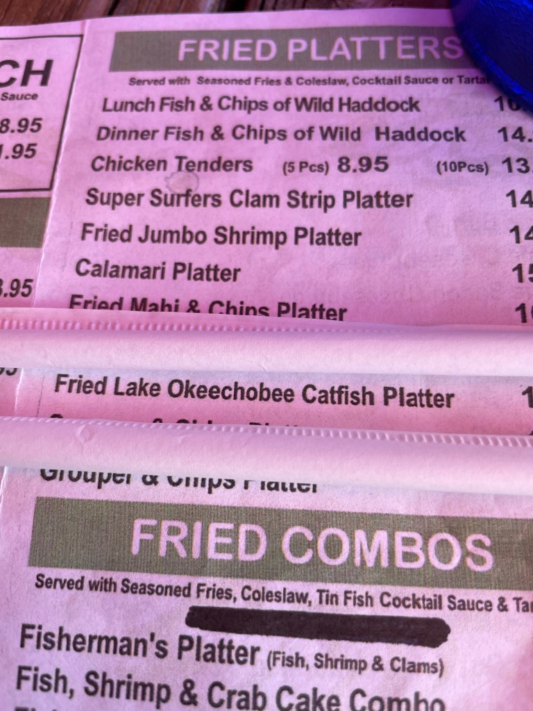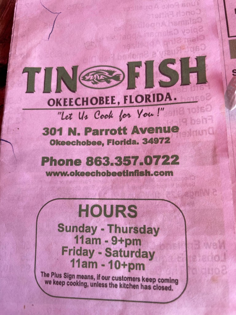 Made it to check out Lake Okeechobee today. Saw another alligator. I was checking out an Airbnb that said there were allocators around. Assuming they meant alligators. Unless the allocators are allocating how many alligators are around. Anyway we ate ate the Tin Fish in Okeechobee. I had the Okeechobee catfish platter. Life is great.