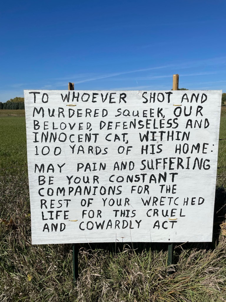 We went out gravel road riding today and came across this sign. It seems like they really have a lot of anger towards whoever murdered their cat. So sad.