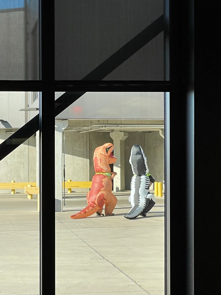 The trip begins today. Halloween. We are at Joe Foss Field in Sioux Falls SD. Looks like they brought out dinosaurs for trick or treat to the runway!