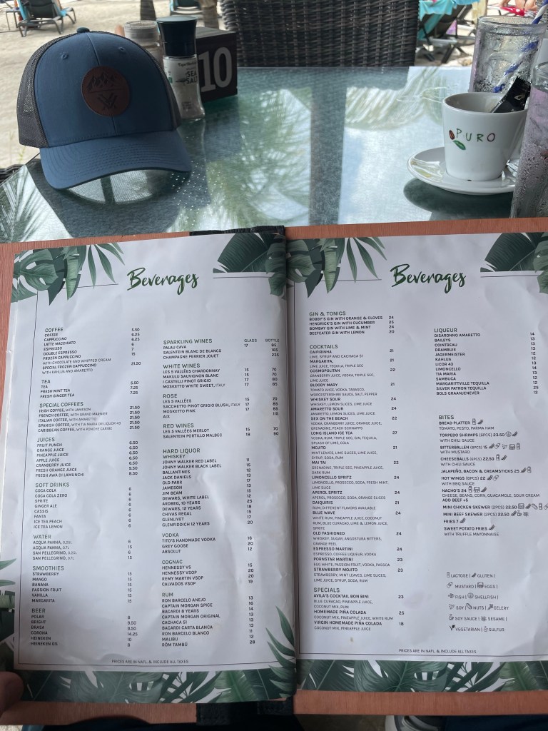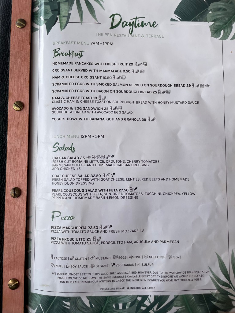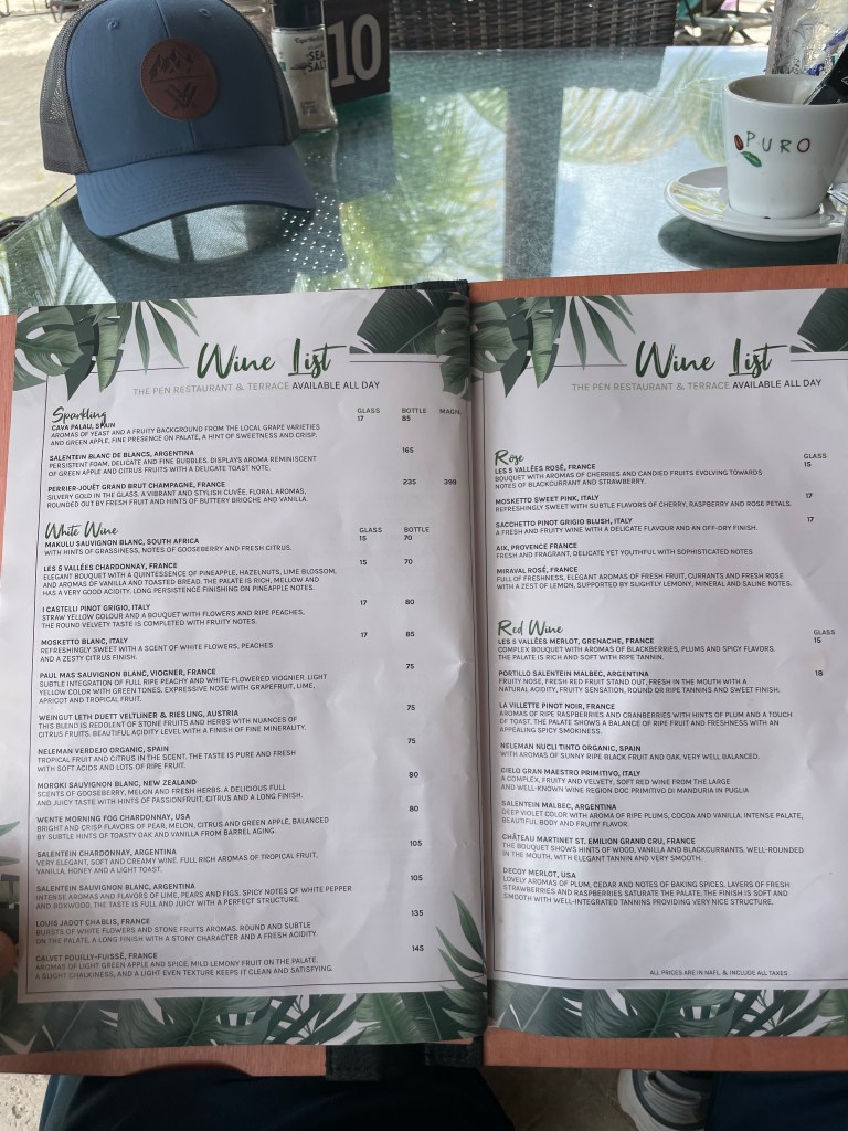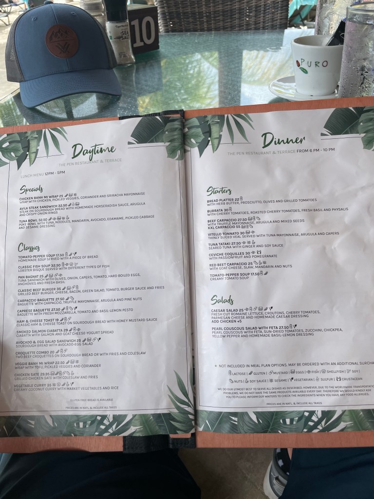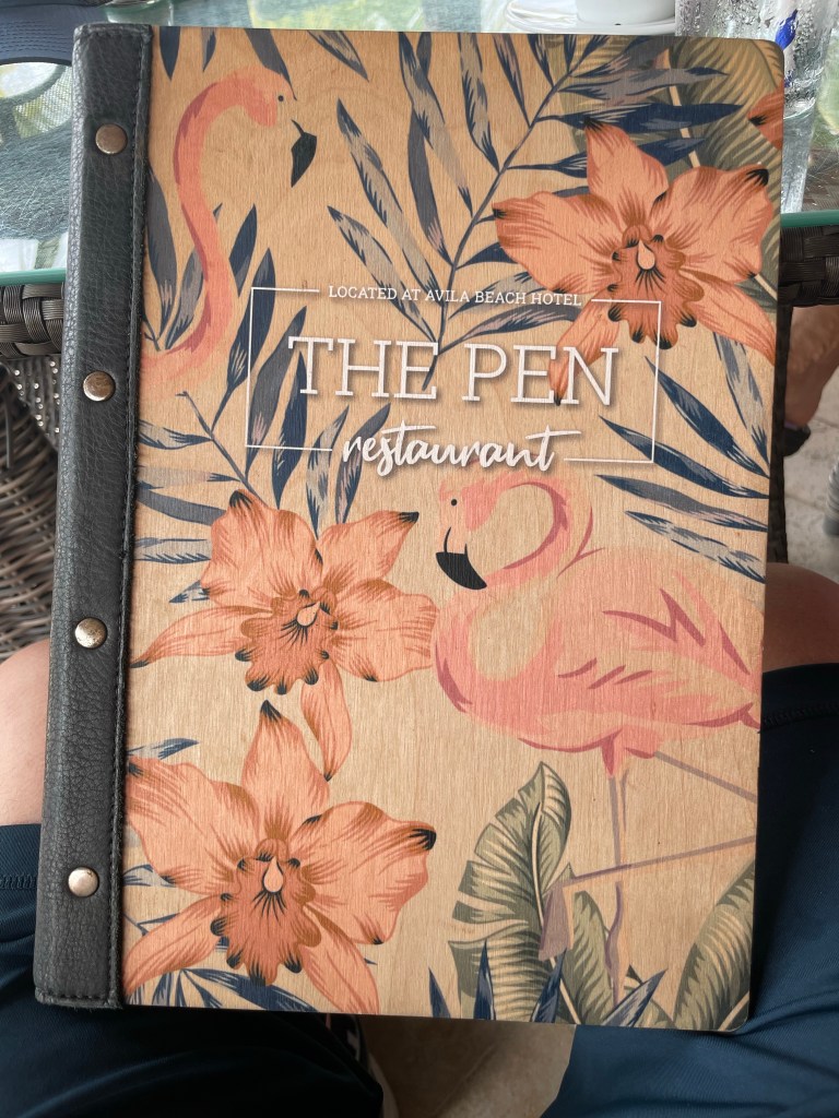 At the Avila Beach Resort today. Nice place. The beach is protected by a breakwater. Currently sitting at The Pen Restaurant for lunch. Then massages after. Here is the menu.