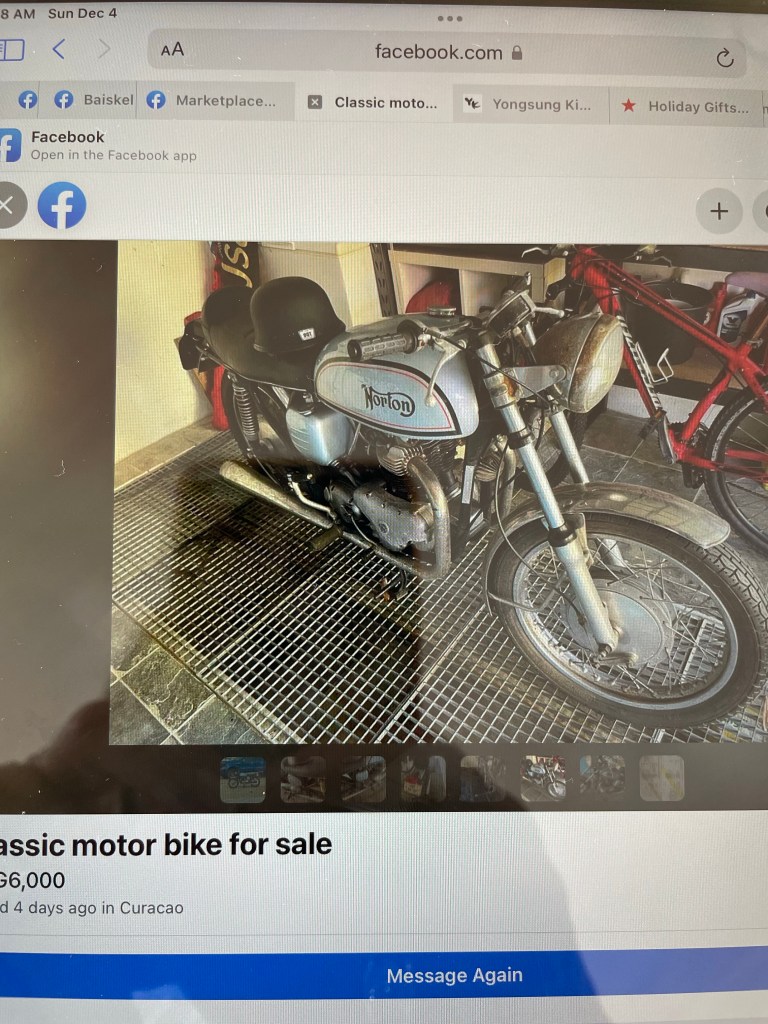 So this classic Norton is for sale on Curacao. It appears to be in good shape. Price is about $3400.00 USD. I will need to do some checking on registration and insurance and how that all works. Might be a fun keeper to ship back with me to the States.