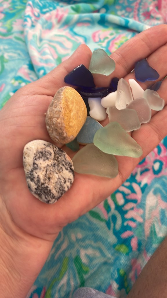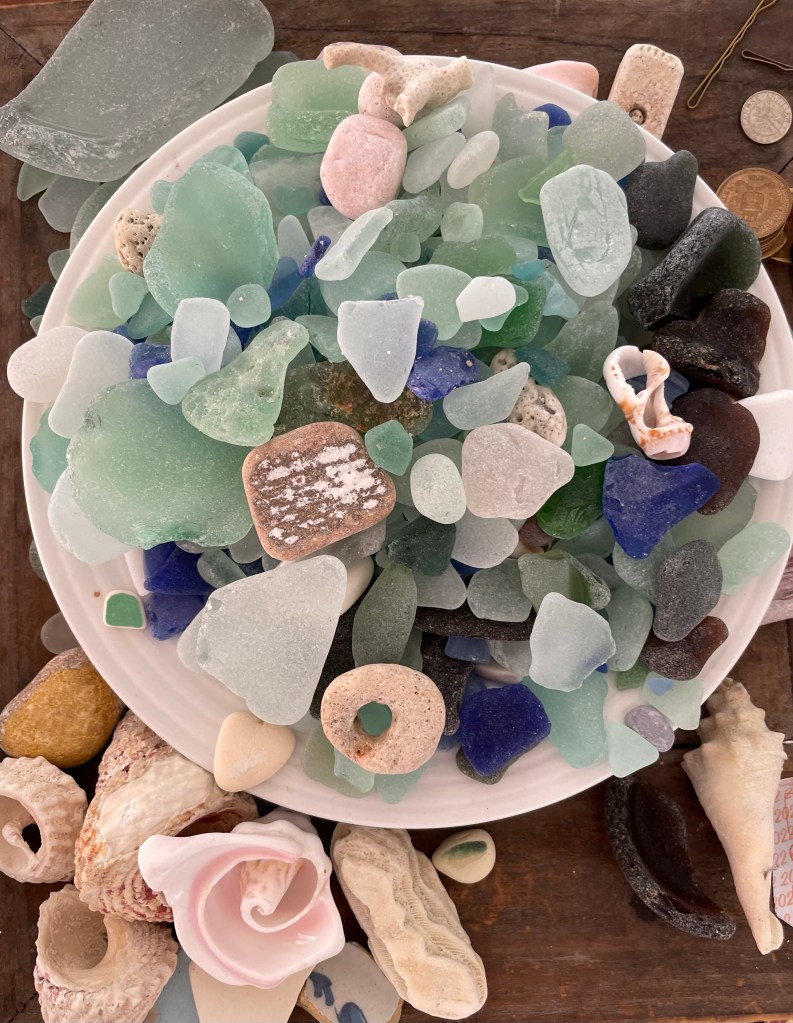 Quite the variety of sea glass here. Sea glass is broken bottles which are smoothed by the ocean and eventually make it to shoe. There are numerous shapes and sizes for sea glass treasure hunters. Here are a few examples. A few shells mixed in