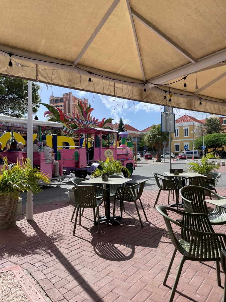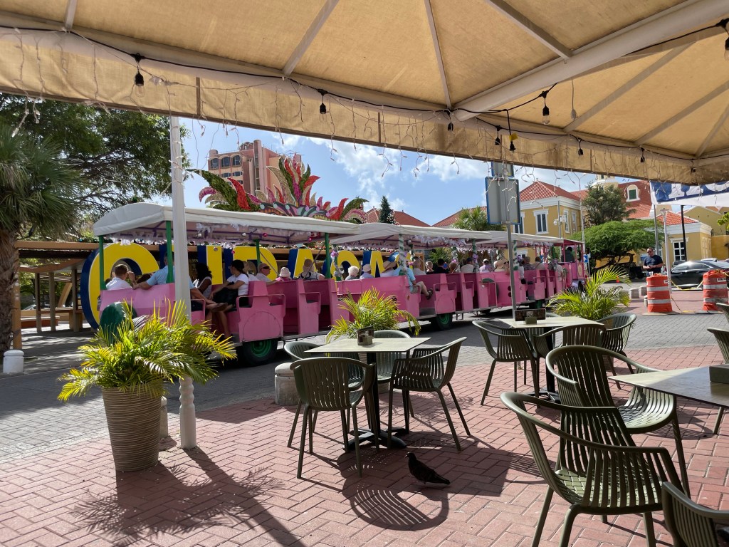 Looks like there is a wheeled train tour on the island. Showing all the sights that are the sights. The passengers seem relaxed.