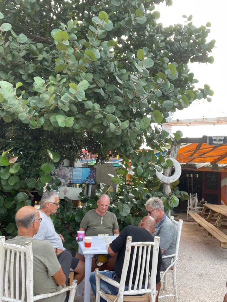 At tugboat beach today. A tugboat sunk here and is now an underwater attraction. A lot of snorkelers and divers here. They have a n art area here you can make your own painted souvenir here. Cool idea. Dominos seems to be the game of choice here.