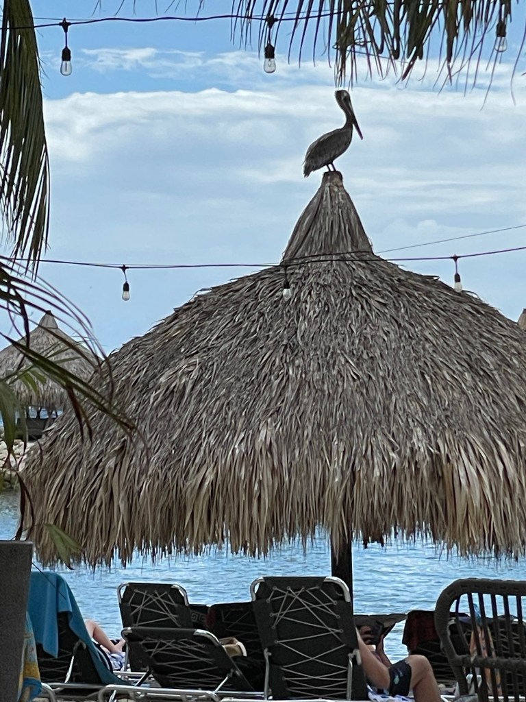 Went to Blue Bay Beach today and ate at the Coast Restaurant. Very nice selection of food here. The service was great. We will return. Saw a cool pelican resting on top of a palapa on the beach.