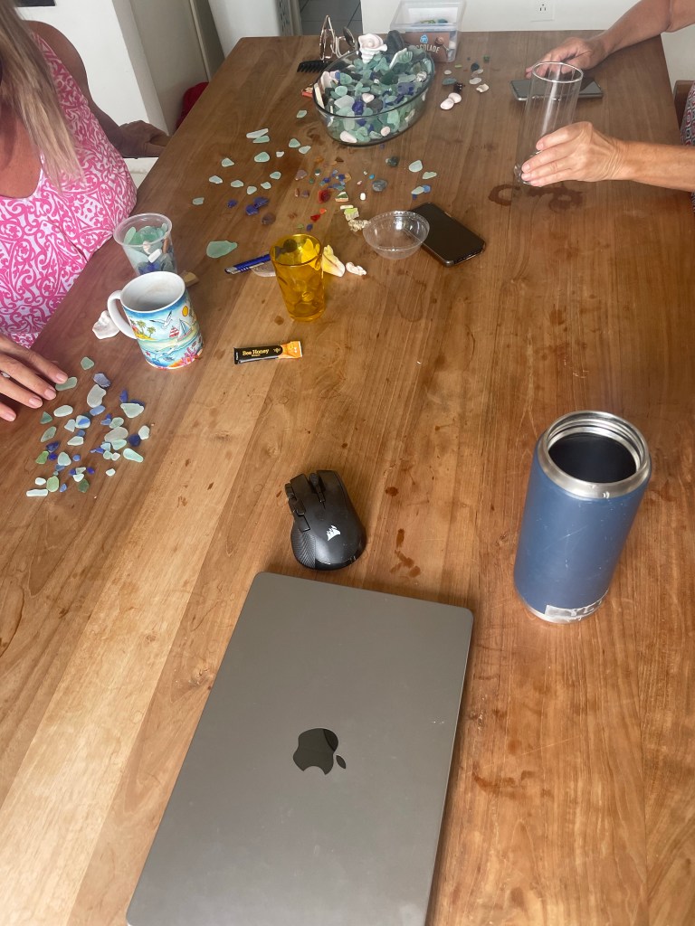Turns out there is a big call for sea glass collectors. Here are two expert hunters comparing their sea loot. Sea glass is made when broken glass is discarded in the ocean. The ocean puts a patina on the glass and it ends up on the beach. I am told good sea glass has a frosty finish and has an interesting shape and/or color. Cost effective hobby.
