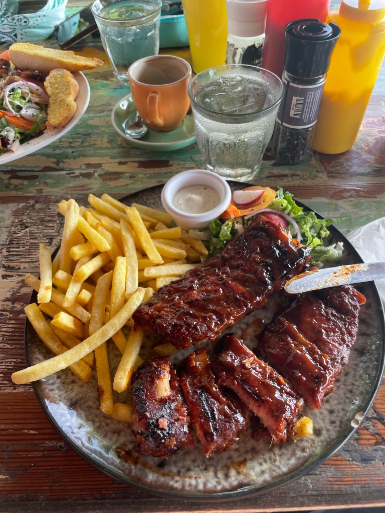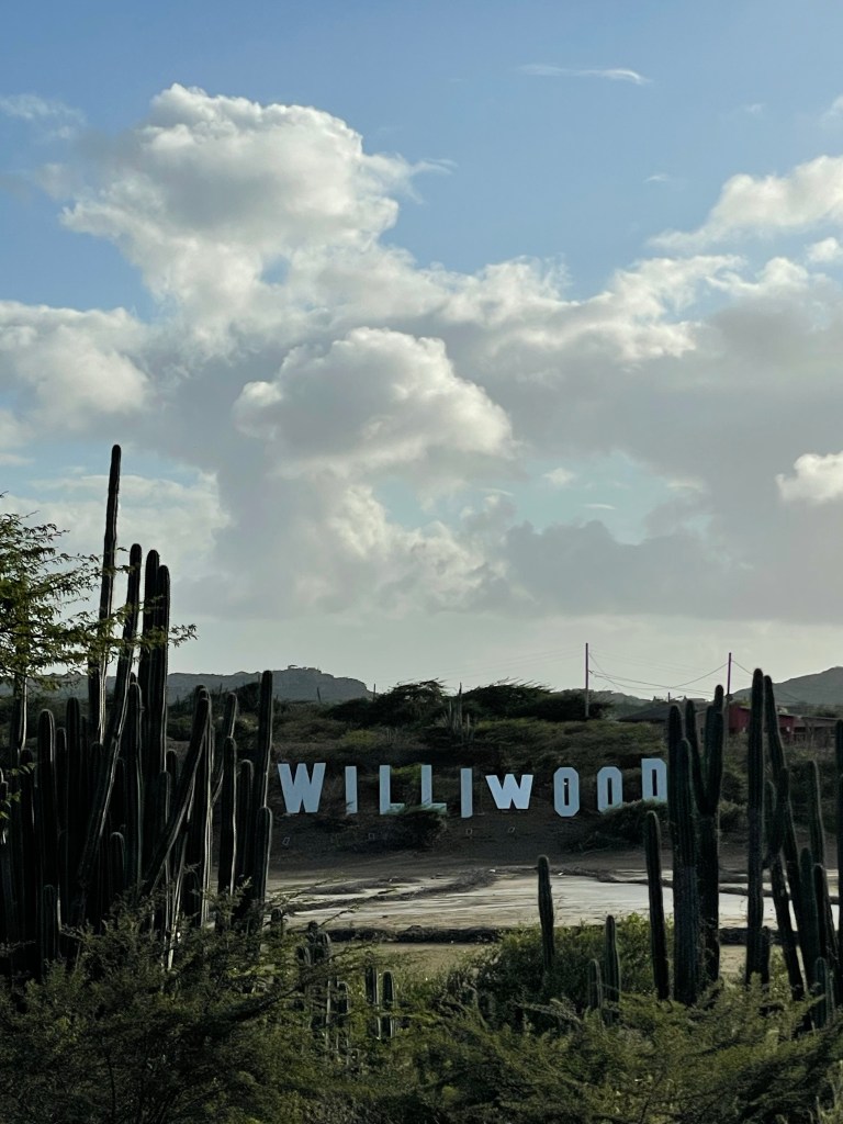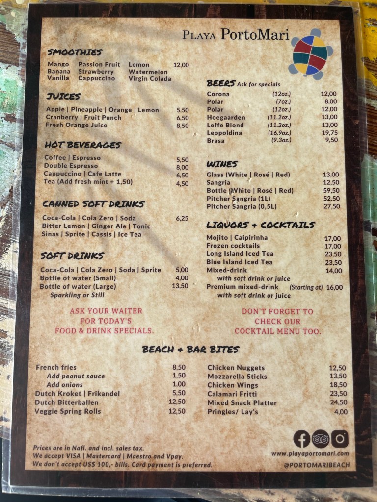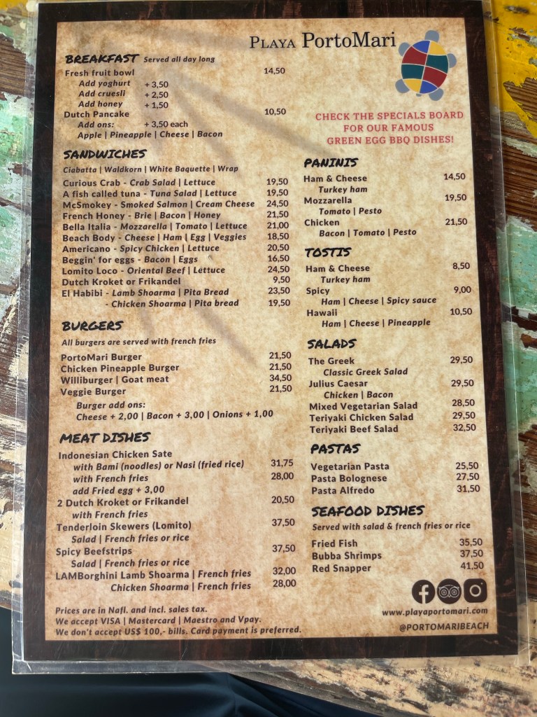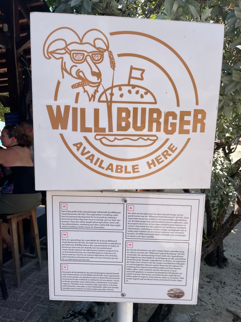 So we were at Playa PortoMari again today. We really love this beach. We ate at the home of the Williburger. Which is goat. I opted for the pork ribs and fries which were awesome. There is a sign out by the pelicans for Williwood. Reminiscent of the Hollywood sign. The ribs were on a board not the hard menu.