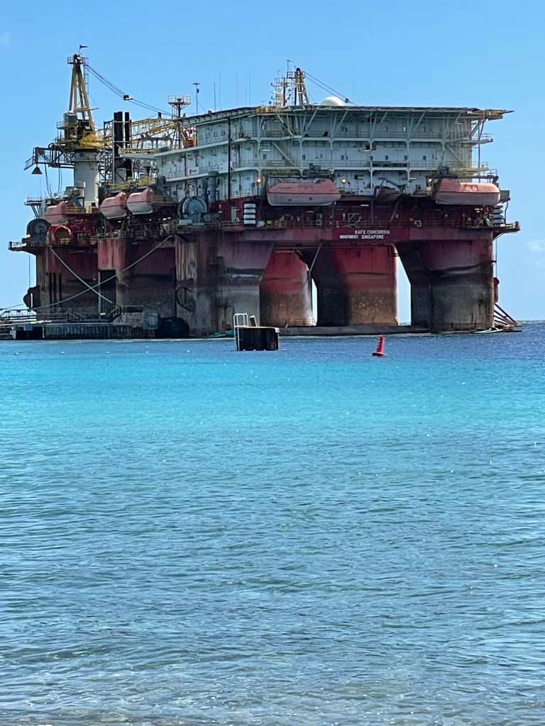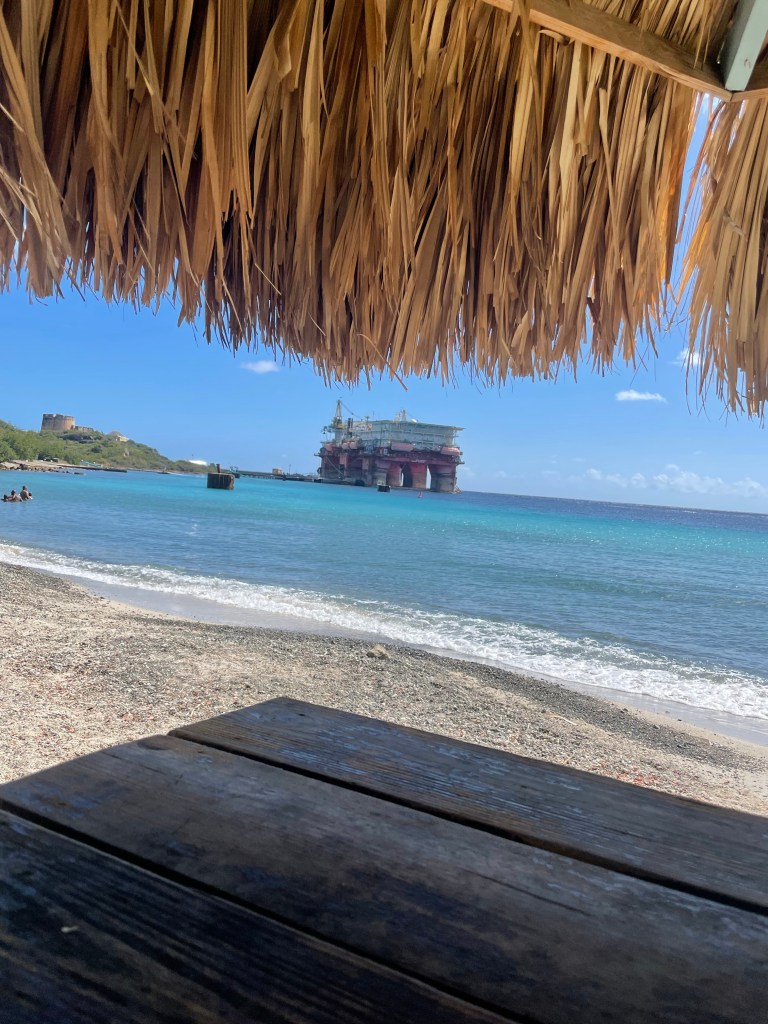 Pretty massive oil rig diced at Caracasbaai. It has been here the whole time I have been on the island. You would think they would move it out to sea and maybe drill for oil or something like that. Maybe it is being repaired or they ran out of places to drill. Massive structure though. photos from the beach picnic tables with palapa covering. Life is good.